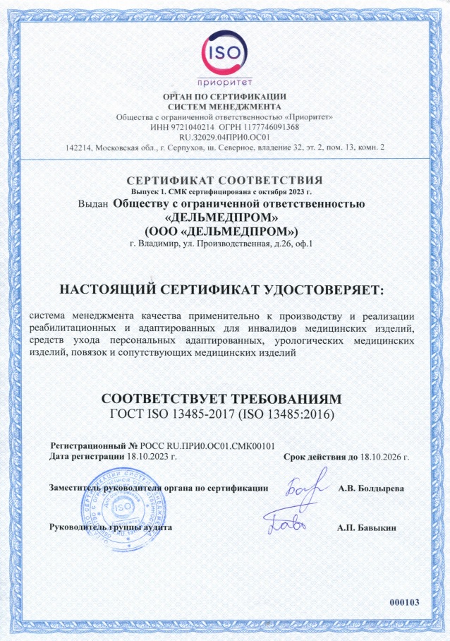 ООО «Дельмедпром» имеет Сертификат соответствия требованиям ГОСТ 180 13485-2017 (180 13485:2016).