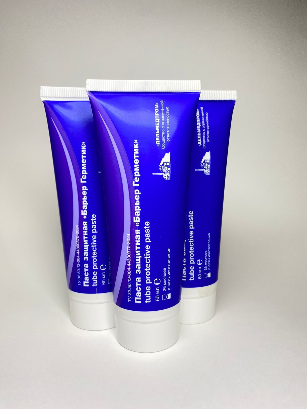 Паста защитная «Барьер Герметик», туба, 60 г. - нестерильное вещество и/или материал, предназначенный для наложения на перистомный и/или околораневый участок кожи с целью защиты этого участка от агрессивных выделений организма (например, кала, мочи, экссудата из раны) и/или их изолирования, для создания барьера против протекания, различных выделений (экссудат, кровотечение, пот и т.д.) и/или обеспечения герметичного уплотнения для стомного устройства или раневой повязки, для ограниченного изолирования поврежденных участков эпидермиса, а также для снижения рисков развития аллергических и воспалительных процессов (дерматитов различной этиологии) на коже, возможного бактериального и грибкового инфицирования повреждённых перистомных и/или околораневых участков кожи, для восстановления естественных свойств кожи, на основе гидроколлоидных полисахаридов, для формирования гелеобразных покрытий (повязок).